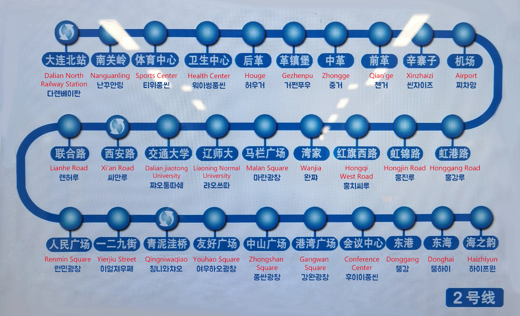 2호선은 하이즈윈역(海之韵)에서 지창역(机场)(다롄 저우수이쯔 국제공항 근처)까지 운행되며, 해안 풍경과 공항 접근성을 고루 갖춘 노선입니다. 다롄에 항공편으로 오가시는 분들에게 가장 먼저 혹은 가장 마지막에 접하게 되는 노선일 가능성이 큽니다.